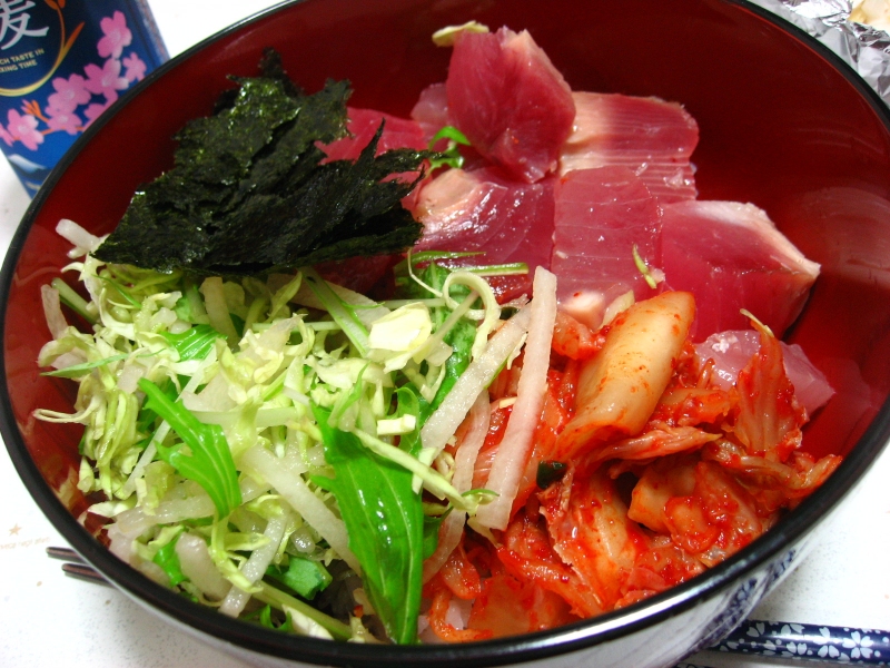 夕食は嫁特性のまぐろ丼+チープに金麦。