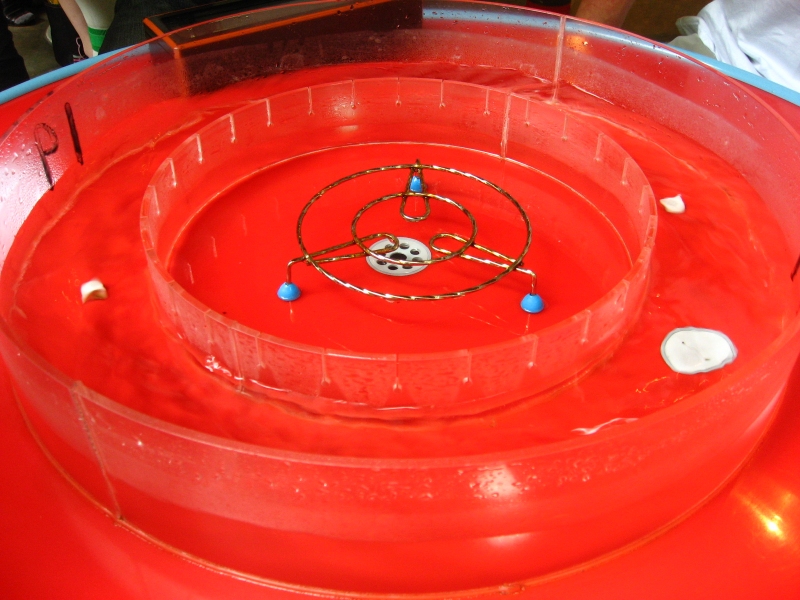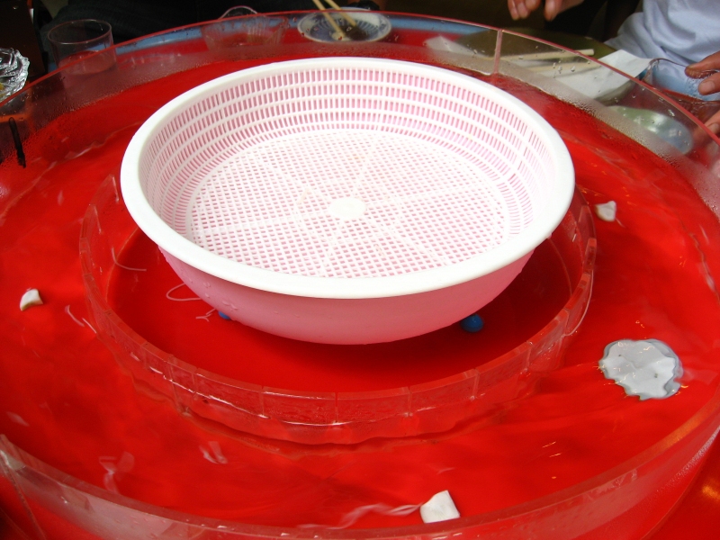 そうめん専用の円卓と丸太椅子の情緒ある光景。
