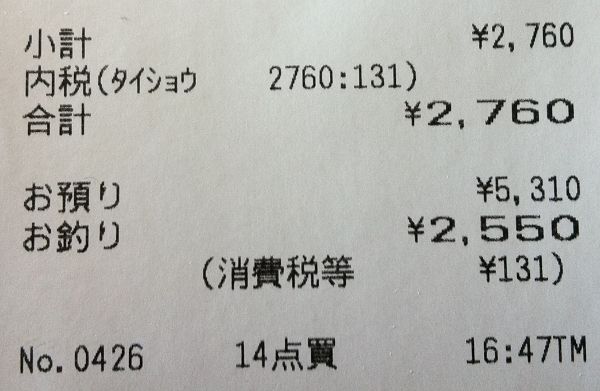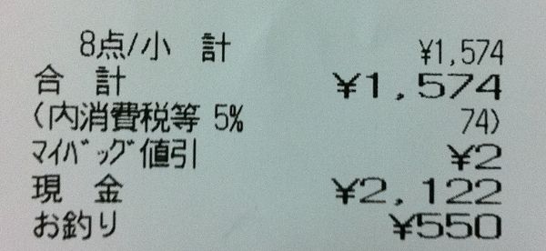 合計1574en(マイバック割引2en)、支払い2122en、おつり550en。