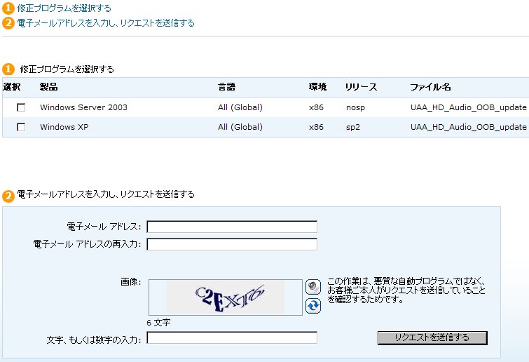 ダウンロード先 : (http://hotfixv4.microsoft.com/Windows%20XP/sp2/UAA_HD_Audio_OOB_update/5013/free/216955_intl_i386_zip.exe)