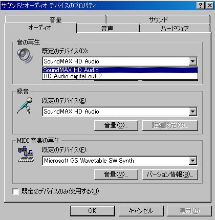 規定のデバイスを「SoundMAX HD Audio」にする。