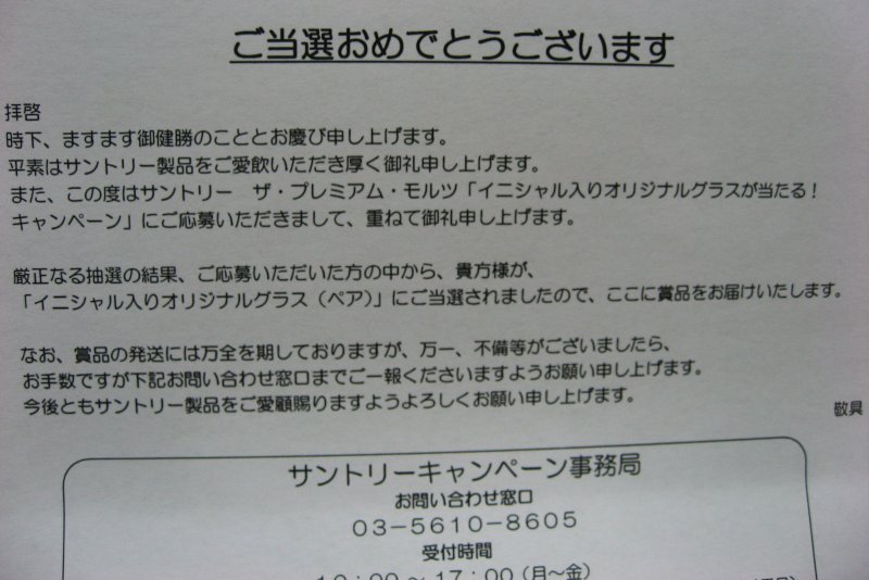 お中元とサントリーからの贈り物 2009年07月24日 カテゴリ:一般日記 mixiチェック まずは最近届いたお中元。 広島のSuperBrotherWILDやっしぃから♪ 超極上品。南高梅の宝梅!! 続いてサントリーからの贈り物。 プレミアムモルツのイニシャル入りキャンペーングラスが当たりました☆ P.S. それでもやっぱりプレミアムビールはアサヒのプライムタイムが好き(でした) 全然売ってる店舗見かけないんですが…。 タグ :#南高梅#宝梅#プレミアムモルツ#キャンペーングラス#プライムタイム 「一般日記」カテゴリの最新記事 人気記事ランキング コメント コメントする コメントフォーム 名前 コメント 評価する リセット リセット 顔 星 投稿する 情報を記憶 トラックバック