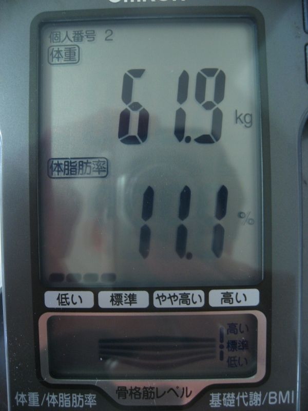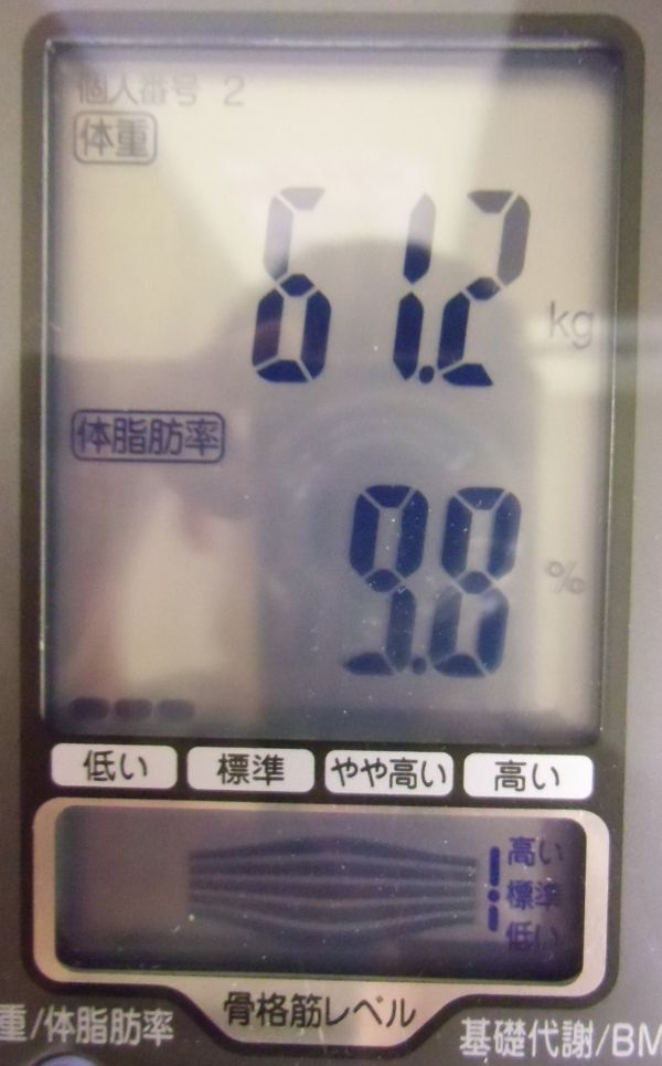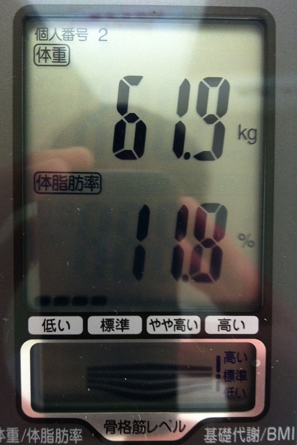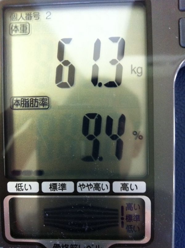 (体重:61.5⇒64.1kg、体脂肪率:12⇒14.3%、BMI:21.3⇒22.2、体年齢:29⇒32才)