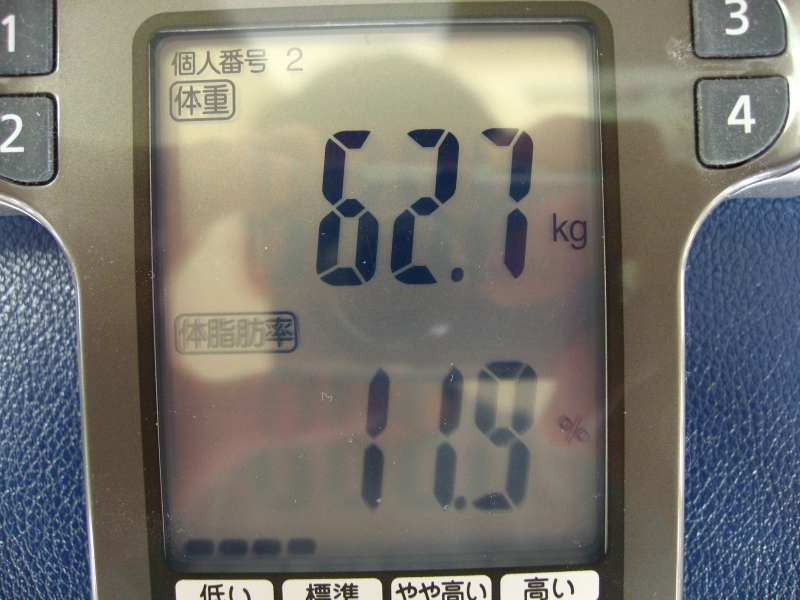 体重:61.2kg,体脂肪率:10.9% (歴代最高記録:7.9%)